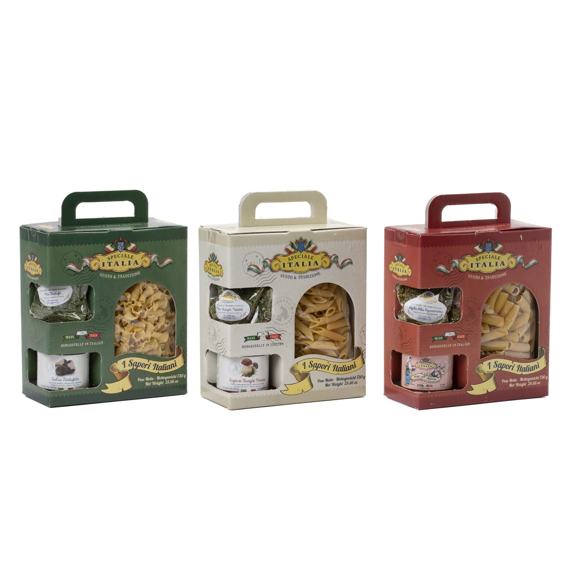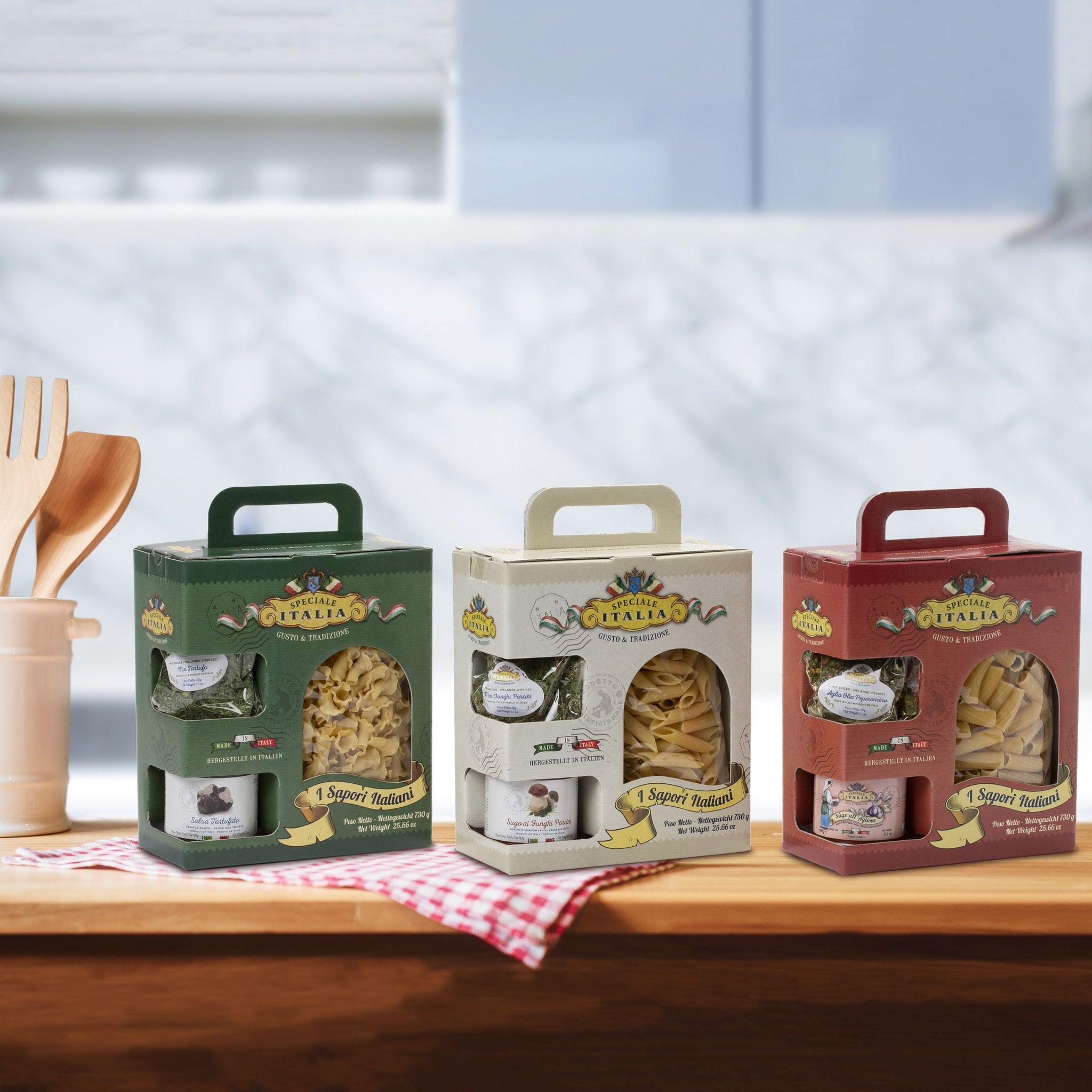 Realizza deliziosi piatti tipici della cucina italiana con la confezione regalo pasta tris di sapori italiani, composta da prodotti gastronomici selezionati quali pasta di semola, spezie e sughi